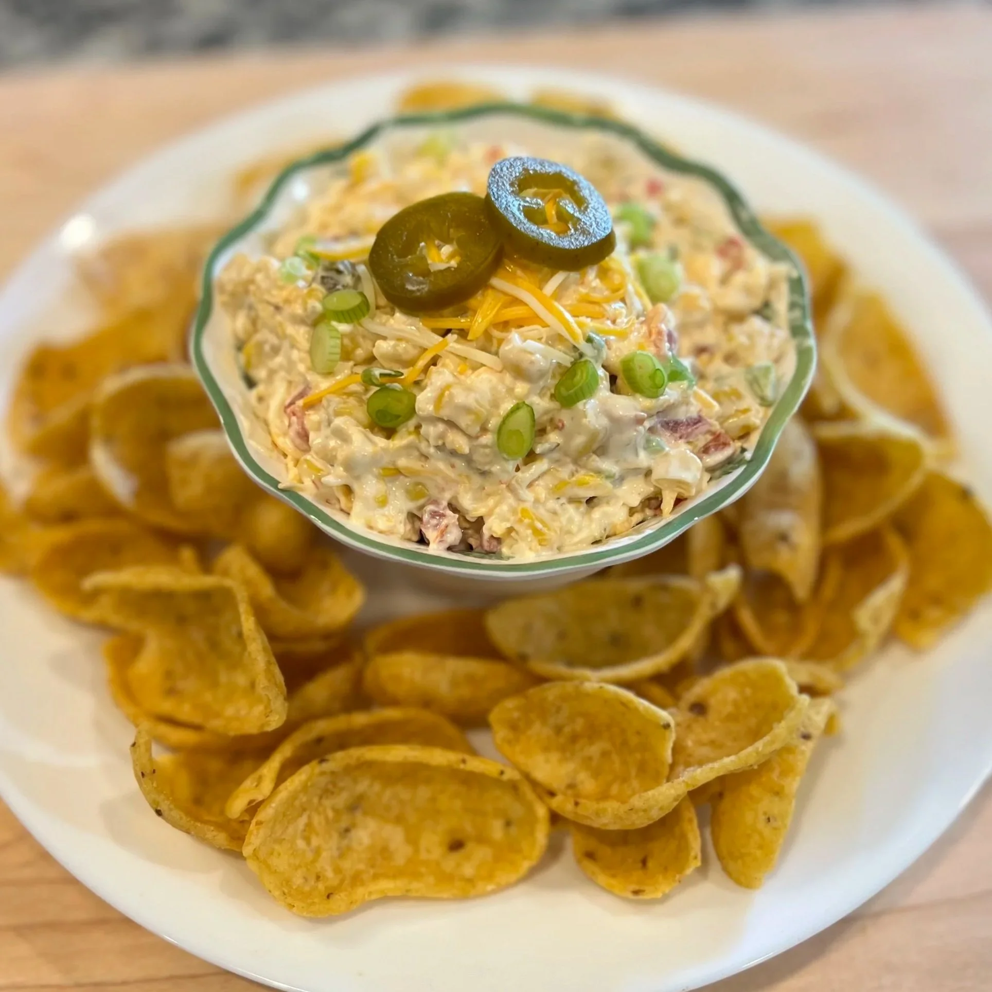 Add the cream cheese, mayo and garlic powder to a large bowl and stir to combine. Add the corn, pimentos, jalapeños, and green onions and mix well. Then add shredded cheese and stir to mix everything together. Cover and refrigerate 4-6 hours or overnight. When ready to serve, place on serving bowl of your choice and top with a little cheese, a few chopped green onions and a couple of slices of those pickled jalapeños. Serve with your favorite chips, I like corn chips with this, and enjoy!!